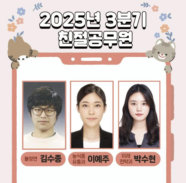 [파이낸셜경제=김기보 기자] 충북 괴산군은 2025년 3분기 친절공무원으로 김수종 주무관(불정면사무소), 이예주 주무관(농식품유통과), 박수현 주무관(미래전략과)을 선정했다고 밝혔다.