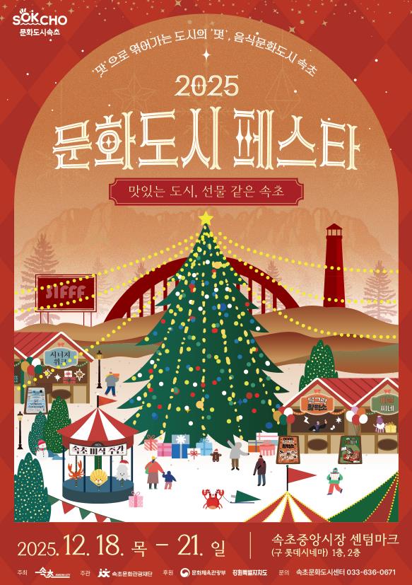 [파이낸셜경제=조성환 기자] (재)속초문화관광재단은 속초시의 대한민국 문화도시 1년 차 사업을 마무리하며 오는 12월 18일부터 21일까지 4일간 속초중앙시장 센텀마크(구 롯데시네마) 에서 대한민국 문화도시 성과공유회‘2025 문화도시 페스타’를 개최한다.