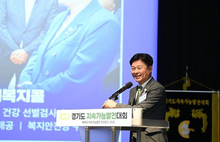 | ▲ 조용익 부천시장이 2025년 경기도 지속가능발전대회에서 ‘지속가능한 내일, 부천이 답하다’를 주제로 기조강연을 하고 있다. |
