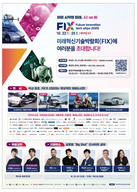FIX 2025는 모빌리티, 로봇, ICT, 스타트업 등 지역 미래산업을 아우르는 대표 전시회로, 통합 개최 2회째를 맞아 참가 기업 수가 지난해 544개사에서 585개사로 확대됐다.