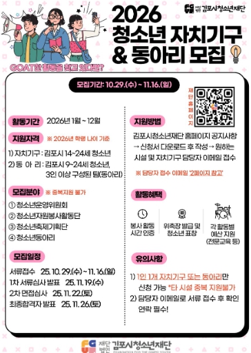 [파이낸셜경제=김기보 기자] (재)김포시청소년재단에서 2026년 한 해 동안 김포시 청소년 수련시설을 함께 이끌어갈 청소년 자치기구 및 동아리 참여 청소년을 오는 10월 29일부터 11월 16일까지 모집한다.