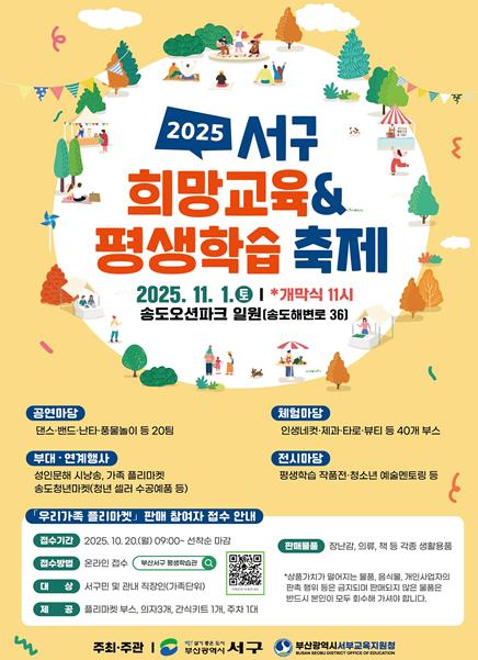 [파이낸셜경제=김영란 기자] 부산 서구는 오는 11월 1일 송도오션파크에서 서부교육지원청과 공동으로 '2025년 서구 희망교육 & 평생학습 축제'를 개최한다.