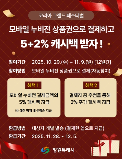 [파이낸셜경제=김예빈 기자] 창원특례시는 오는 10월 29일부터 11월 9일까지 12일간, ‘코리아 그랜드 페스티벌’ 기간에 맞춰 모바일 창원사랑상품권 ‘누비전’ 결제 시 최대 7% 캐시백을 제공하는 특별 이벤트를 진행한다고 24일 밝혔다.