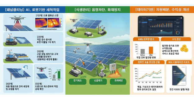드론은 열화상 스캔을 통해 오염과 핫스팟을 전수 분석하고, 자율주행 세척 로봇은 균일한 품질로 패널을 관리한다. AI는 미세먼지와 기상 데이터를 기반으로 최적의 작업 시점을 자동으로 도출한다. 그 결과 기존 2~3일 걸리던 점검은 수 시간 단위로 단축되고, 작업자의 안전 문제까지 동시에 해결된다.
